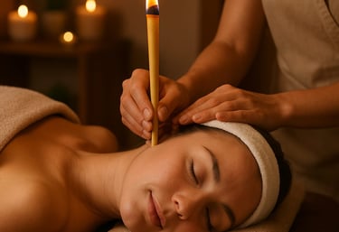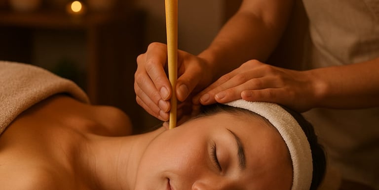 Terapi pembersihan telinga dengan lilin khusus untuk membantu mengurangi sumbatan dan memberikan rasa rileks.